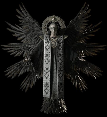 Образ птицы-шамана: Её основной облик — это высокая, величественная фигура в длинном чёрном одеянии и гигантском головном уборе из перьев, напоминающем крылья ворона или совы. Этот образ создаёт ауру первобытного, языческого божества или колдуньи, что идеально вписывается в фольклорную эстетику деревни. Он одновременно пугает и внушает благоговение.