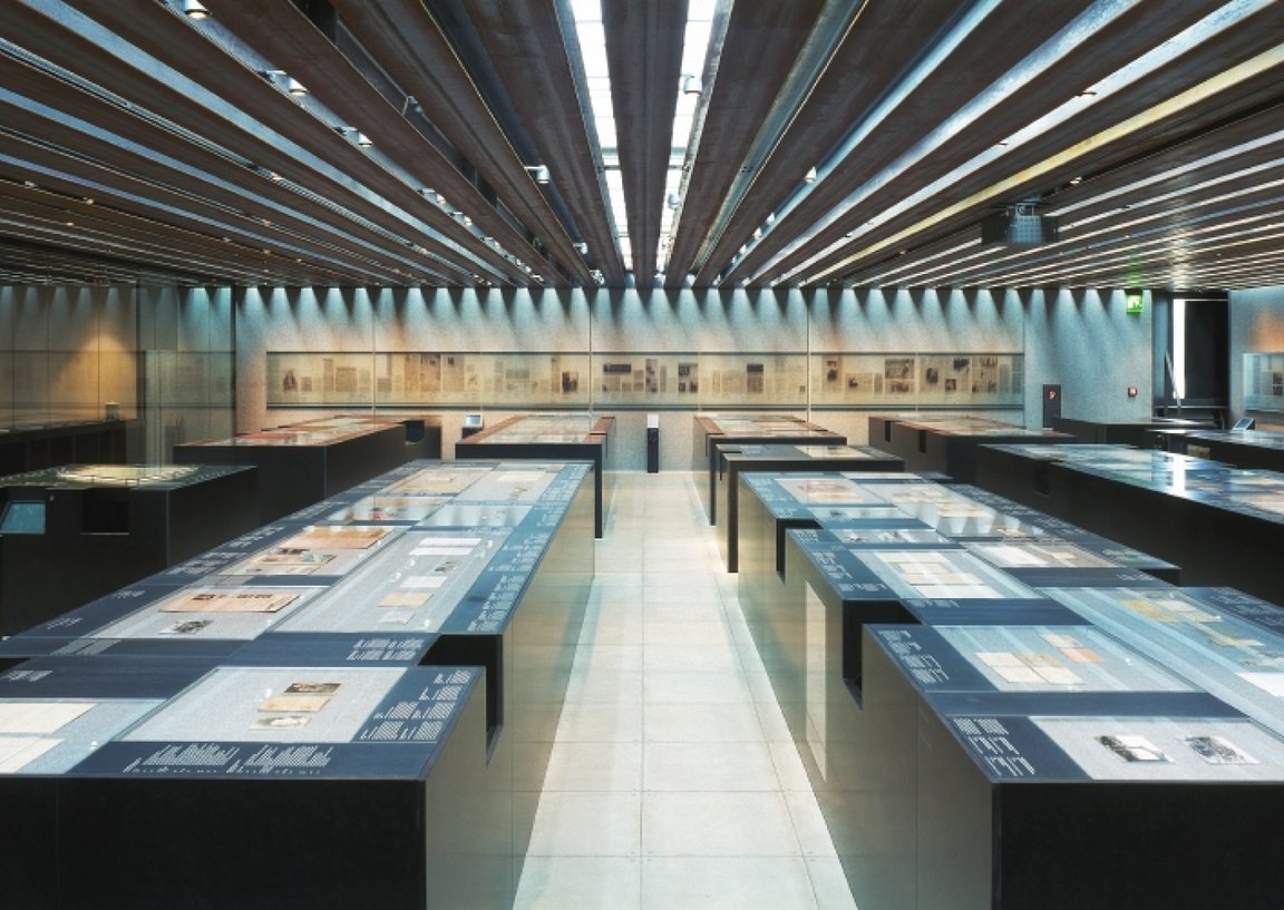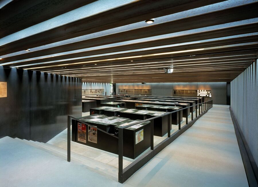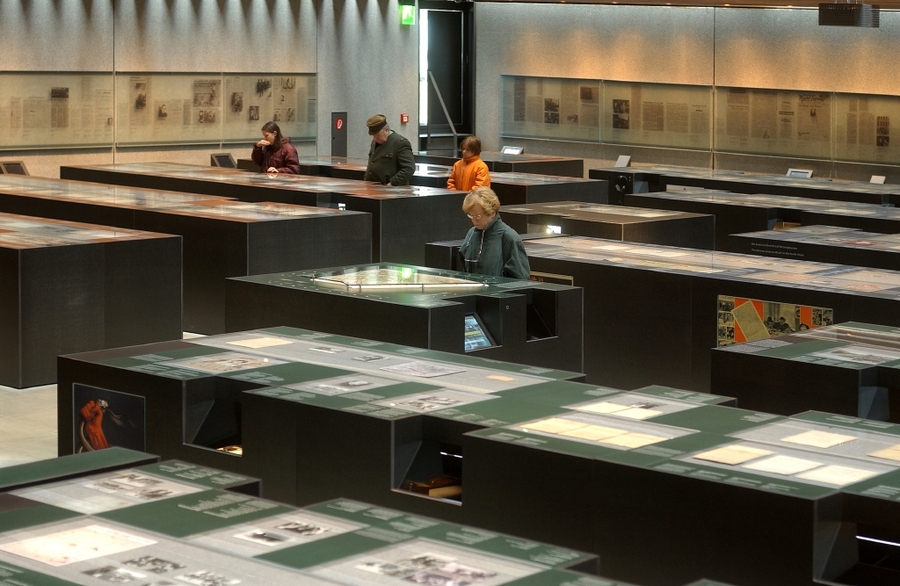 Музей строится на документальных свидетельствах, и это подчеркнуто выражено в экспозиционном решении: ровные ряды тёмных тумб с историческими предметами, фотографиями и документами. Эти столы чуть выше пояса, что позволяет оглядеть всю экспозицию — складывается впечатление, что ты смотришь сверху на карту лагеря с длинными рядами бараков.