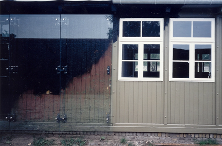 Безликое прямоугольное здание с мутно-зеркальным фасадом отражает мрачный пейзаж бывшего лагеря, как будто заставляя нас смотреть мимо трагедии [1].