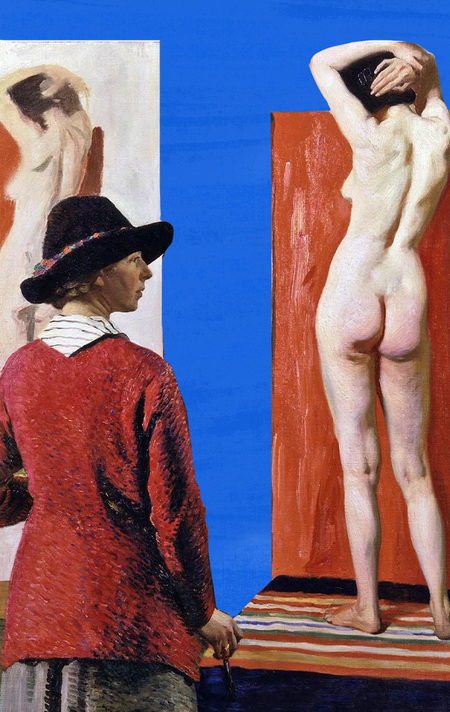 Одним из первых ярких высказываний на эту тему становится «Автопортрет с обнаженной моделью» Лауры Найт. На картине художница стоит рядом с холстом, она полностью одета, на ней красное пальто, юбка, платок, узнаваемая шляпа, а в руках кисть. Перед ней на подиуме в контрапосте позирует обнаженная натурщица. Такая постановка не только утверждает право женщин работать с человеческой анатомией, но и провозглашает независимость от мужчин, так как деятельность художницы никак от них не зависит.