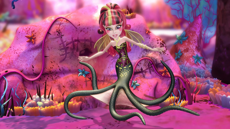 Школа монстров: Большой ужасный риф\Monster High: Great Scarrier Reef (2016) — полнометражный мультфильм, основанный на сериале про учениц школы монстров. Сам сериал изначально создавался в качестве рекламного продукта для американская серии фэшн-кукол с тем же названием. По сюжету герои попадают в подводный мир через бассейн школы Монстров и превращаются в русалок. Для поддержания стилистики сериала, в фильме много ярких цветов, блесток, украшений и мелких деталей. К созданию «русалочьих» форм создатели подошли креативно, герои не просто получают хвосты, они приобретают черты разных морских существ которые подчеркивают их характер и особенности. Лагуна Блю в русалочьем облике напоминает серебристо-голубую летучую рыбу. Фрэнки Штейн напоминает электрического угря. у Дракулауры — щупальца осьминога. Торалей Страйп — кошка-оборотень — имеет черты хищной рыбы крылатки. Есть русалка с двумя головами, русалка-кальмар, русалка-скат.