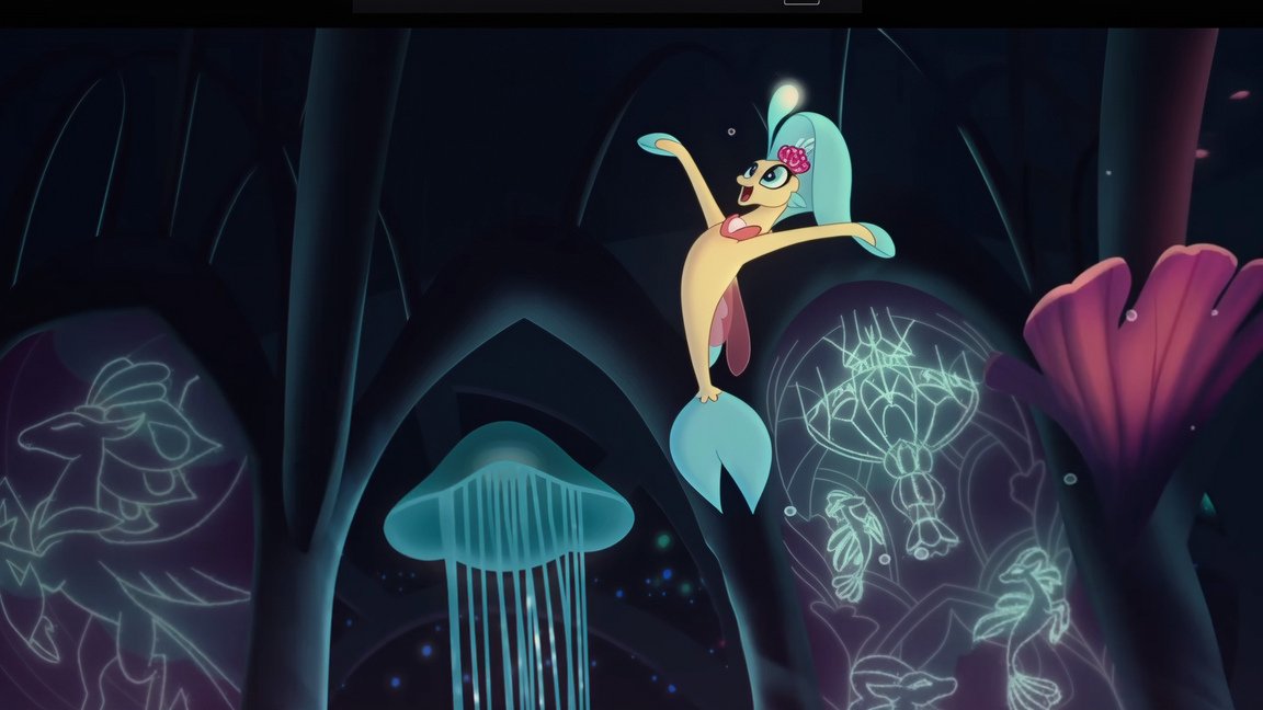 My Little Pony в кино\ My little pony the movie (2017) — американо-канадский анимационный фильм студий Allspark Pictures и DHX Media. Основан на мультсериале «My Little Pony: Дружба — это чудо», который в свою очередь основывается на линии игрушек «My Little Pony» компании Hasbro. Мультфильм повторяет 2д-стилистику сериала, но в некоторых сценах для усиления визуальных эффектов использовались элементы 3D-графики, в основном для задних планов. В истории фигурируют Морские пони -гиппогрифы- второстепенные персонажи. Самые заметне из них- королева Нова и её дочь Принцесса Небесная Звезда (англ.Princess Skystar). Много лет назад, при помощи волшебной жемчужины, гиппогрифы превратились в морских пони, имеющих рыбий (русалочий) хвост и живут в подводном королевстве. Королева Нова, желая посмотреть, действует ли еще магия жемчужины, превращает главных герое в морских пони (русалок) на некоторое время.