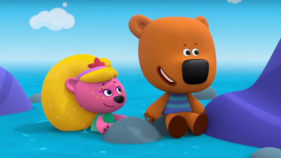 Ми-ми-мишки (2015-2025) — российский мультипликационный сериал, студии «Паровоз» о приключениях медвежат. В серии 206 появляется медвежонок-русалка, она играет с медвежонком Кешей и в конце дарит ему свою брошку. У нее зелено-голубой хвост, розовая шерсть, макияж (вероятно, чтобы показать привлекательность) и длинные золотистые волосы (у других героев сериала волос нет, то есть их добавили как узнаваемый атрибут русалки).