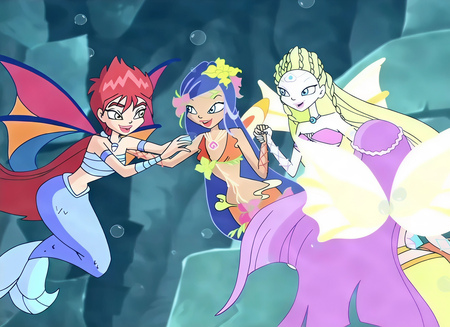 Внешность: Юные девушки подростки. Хвосты по цвету соответствующие верхней части бикини (красный, оранжевый, синий). В образе русалок они могут дышать и разговаривать под водой приобретают супер способности: умение кипятить воду, управлять ей и превращать в лед.