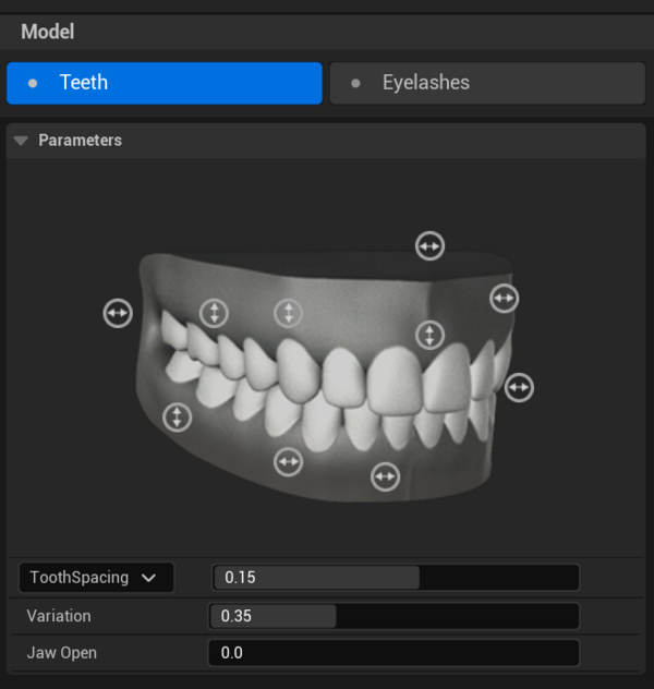 Данный раздел сфокусирован на детализированной настройке челюсти и зубного ряда. Набор профессиональных параметров дает художнику возможность гибко управлять формой, пропорциями и положением элементов.