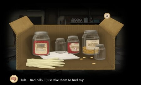 Слева: Коробка с препаратом который принимает девочка, Справа: Символичная надпись на стене, Скриншот из игры Fran Bow, 2015 г.