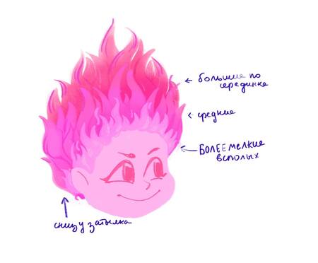 Пламя должно состоять из отдельных ленточек, напоминающих и пряди волос, и всполохи огня одновременно. Длина лент должна плавно увеличиваться от линии роста волос к макушке. Для сходства с огнем также важно добавить плавное изменение оттенка и степени прозрачности геометрии, подобно тому, как цвет пламени определяется его температурой. Помимо этого, важно обратить внимание и на характер движения отдельных всполохов. На концах ленточек колебания должны быть более интенсивными, чем у их основания.