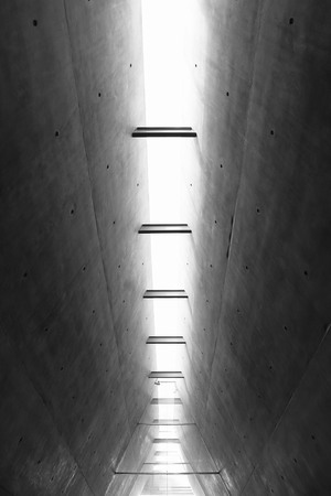 Ландшафт как будто подсказал дизайну экспозиции принцип направления и наклона. По центральной полупустой галерее посетитель проходит в глубь горы — там начинается история концлагерей, параллельно ходу расположены залы, посвященные отдельным главам истории Холокоста.