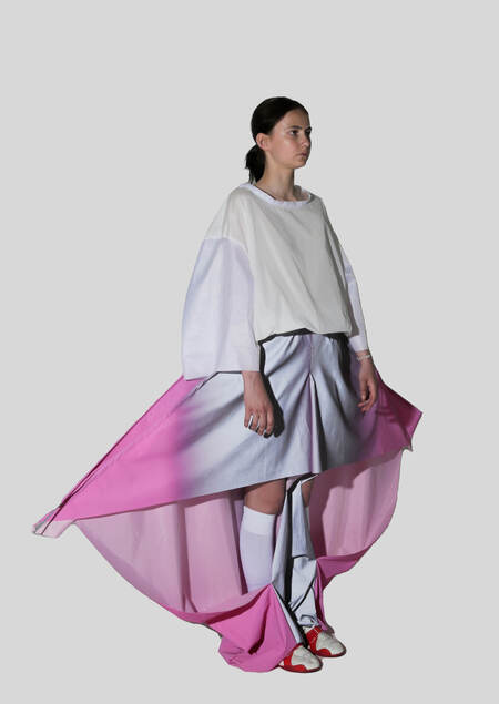 Дипломная коллекция стала размышлением на тему поиска баланса в жизни. Главной задачей проекта является создание авторской коллекции балансирующей одежды, которая уравновешивает хрупкое и нестабильное окружение героя повествования. Так, основным методом формообразования стало кинетическое искусство и метафоричный образ канатоходца.