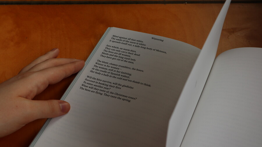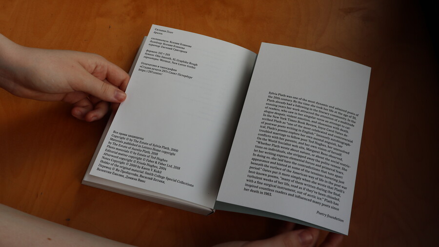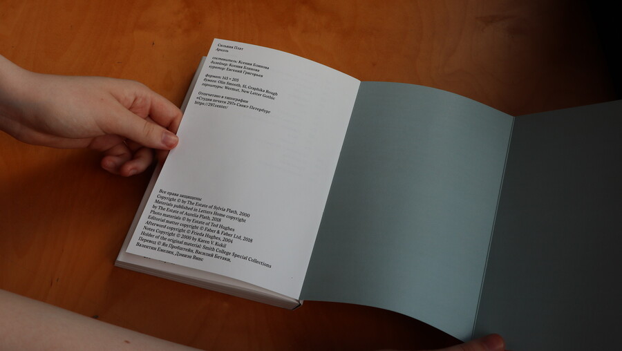 Главным типографическим приемом становится расшифровка черновиков стихотворений и писем из личной переписки Плат. Для расшифровок, подписей и дополнительных текстов вводится вторая гарнитура: New Letter Gothic. New Letter Gothic — пропорциональная гарнитура с характером рисунка моноширинной. Отсылает к печатной машинке (на которой набрано большинство артефактов) и архивам.