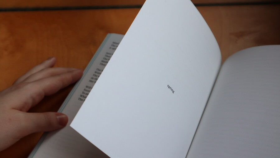 Вход в сборник: на предшествующий первому стихотворению разворот вынесено первое слово стихотворения, выход из сборника организован по такому же принципу.
