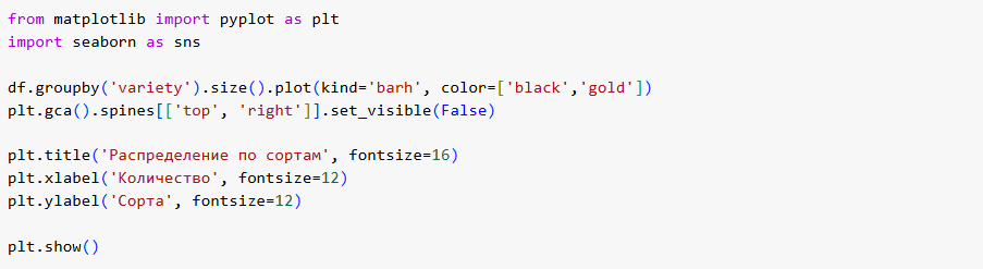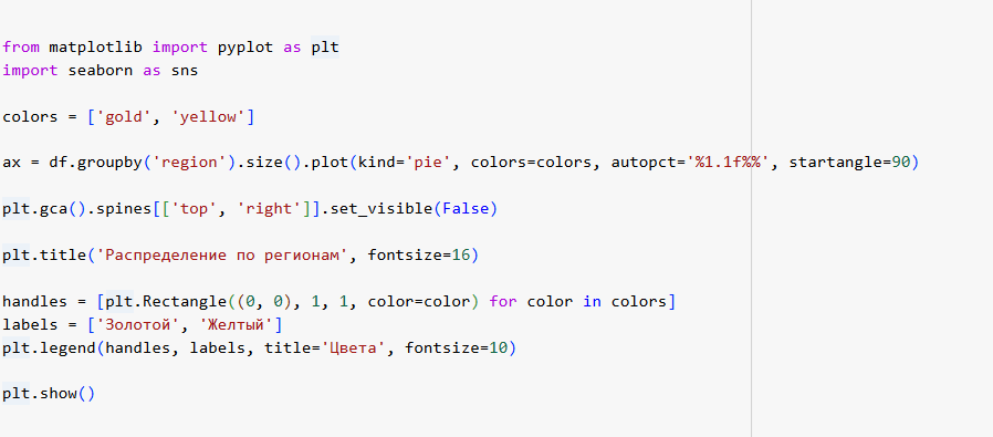 Попробовав создать диаграмму впервые, я осознала необходимость в ограничении, поэтому ограничила количество показателей до 8, а в некоторых случаях даже меньше. Сначала данные группируются в датафрейме по определенному столбцу, затем подсчитывается количество записей для каждого уникального значения в этом столбце. После этого данные сортируются по убыванию, и выбираются первые 8 значений.
