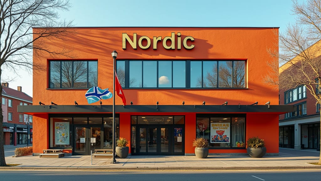 Prompt: A lively street scene during the day, featuring a two-story building at the center. The building has a large, sign with the word 'Nordic' in bold letters. Font is simple, but friendly. The entrance is adorned with majority of flags of Scandinavian countries and posters with scandinavian nature. The lighting is even, capturing the vibrant atmosphere of the street --sref https://i.postimg.cc/6qFcYQhZ/6-ZOs-N2eb-XQpn-RQ7y-T8qr-0-pv684.jpg --sw 900