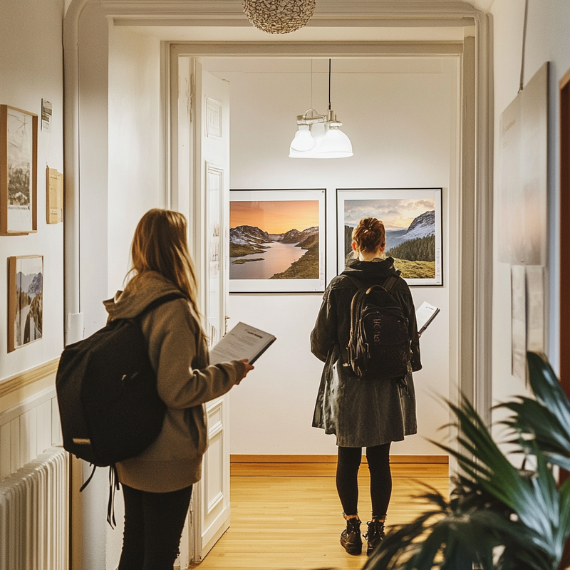 Prompt: Photo of the interior of a Scandinavian language school. In front of us is the school administrator behind the counter. We see her looking out from behind the counter and greeting the students. There are small flags of Scandinavian countries on the counter. The light is warm and subdued. Behind the receptionist’s desk on the wall we see posters of natural Norway and Finland, pictures of happy students. The room is very cozy