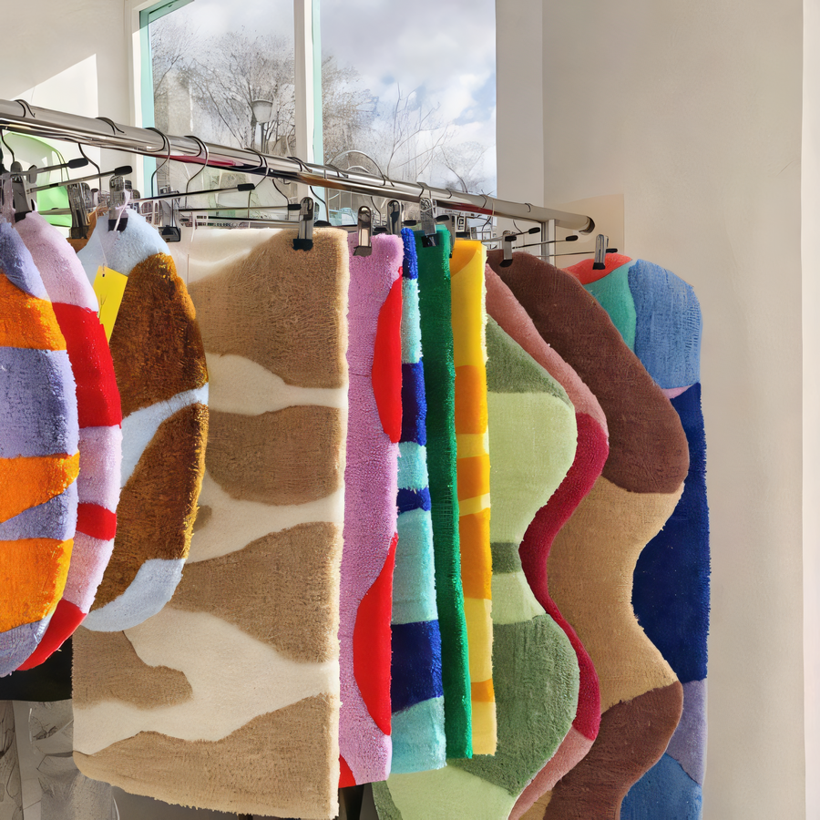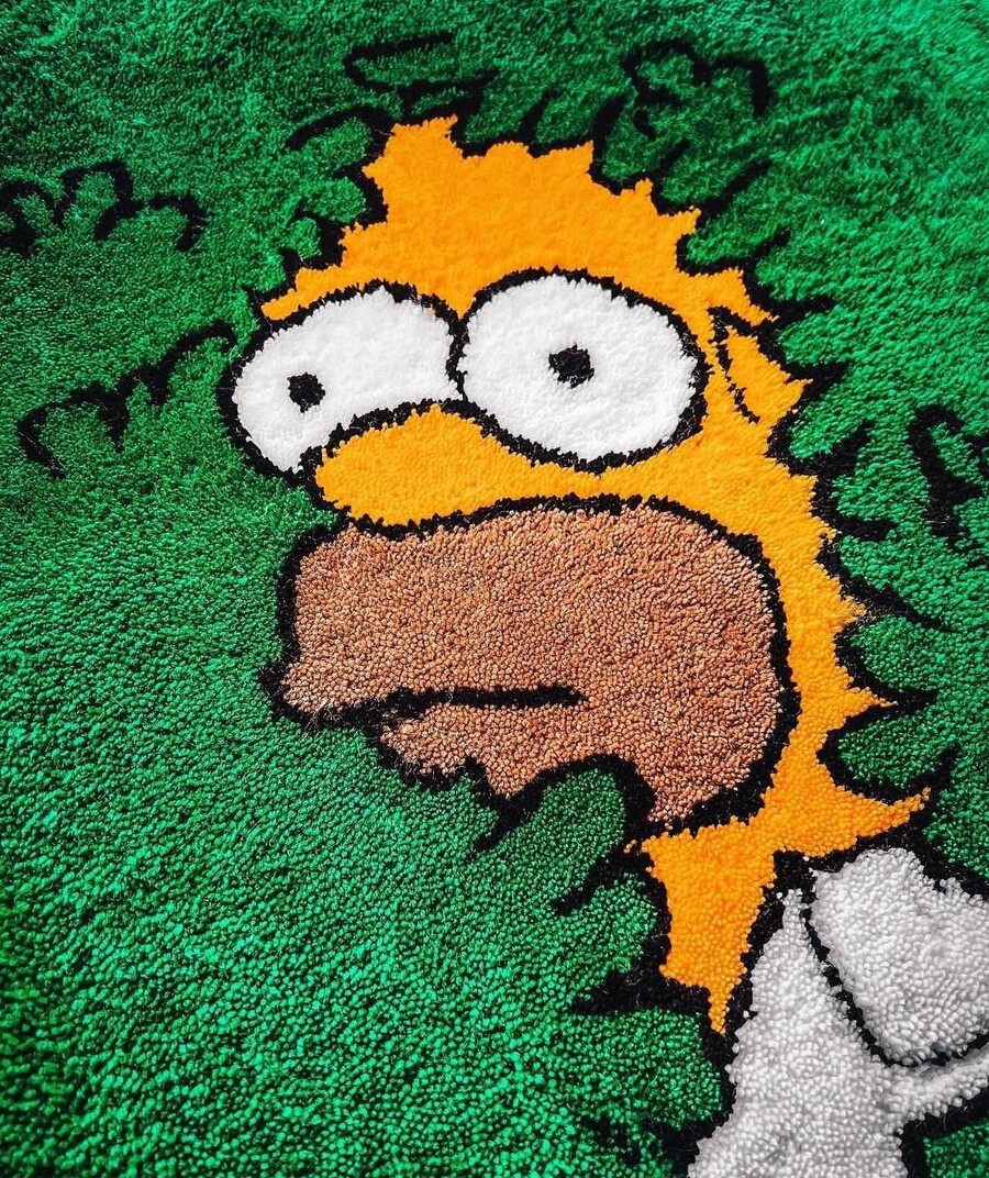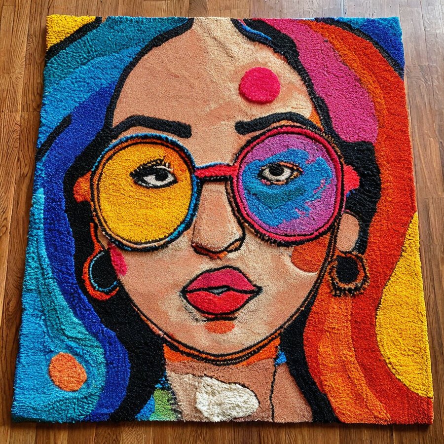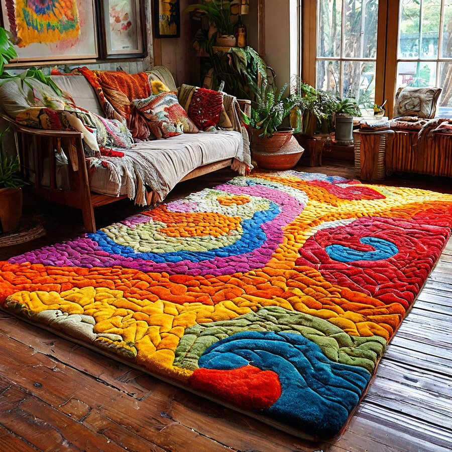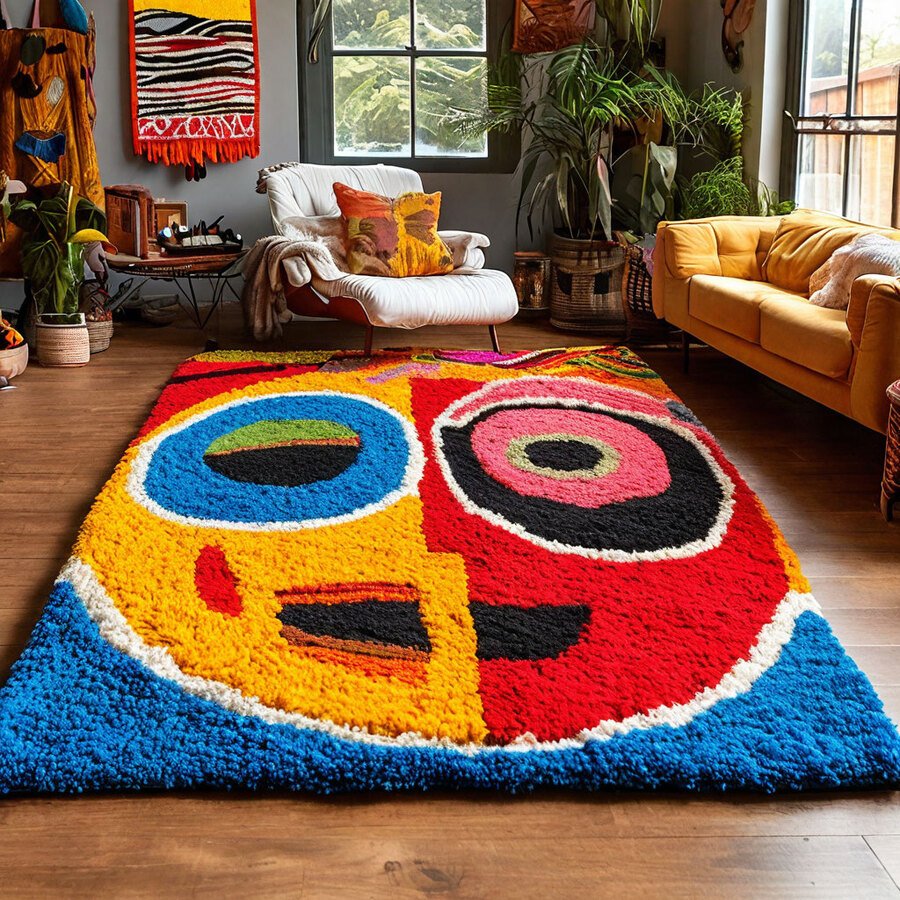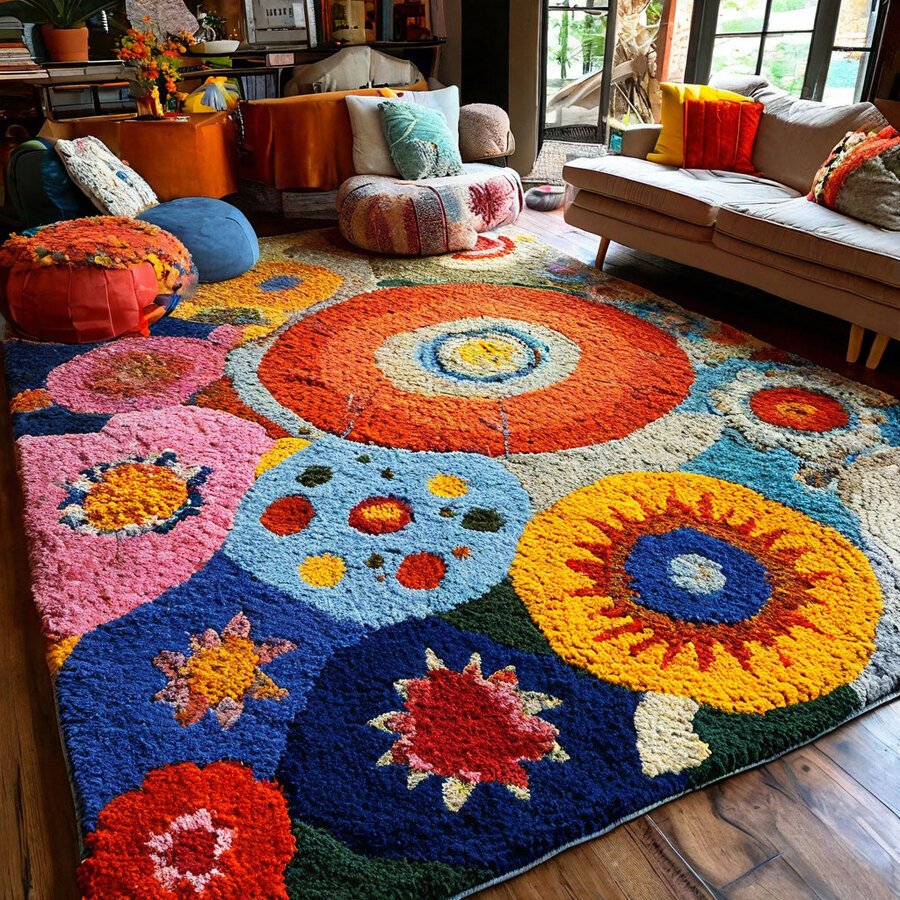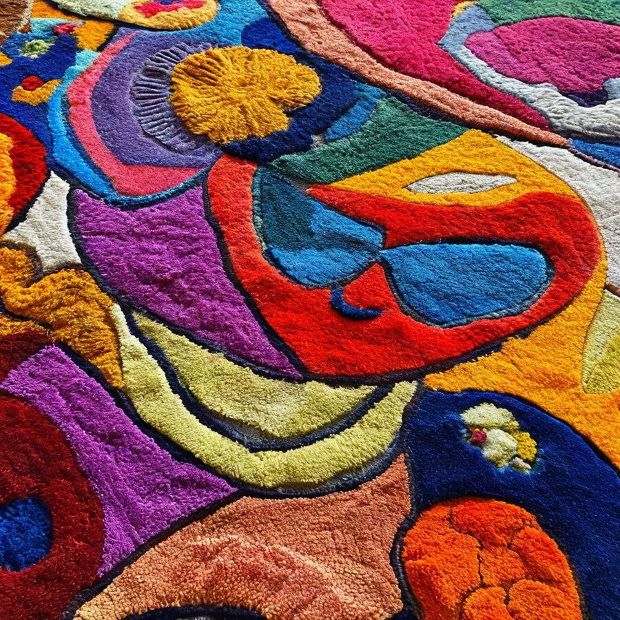 /image prompt: create tufting rugs with a bold and youthful design design as it would be made by hippies in pop art style.