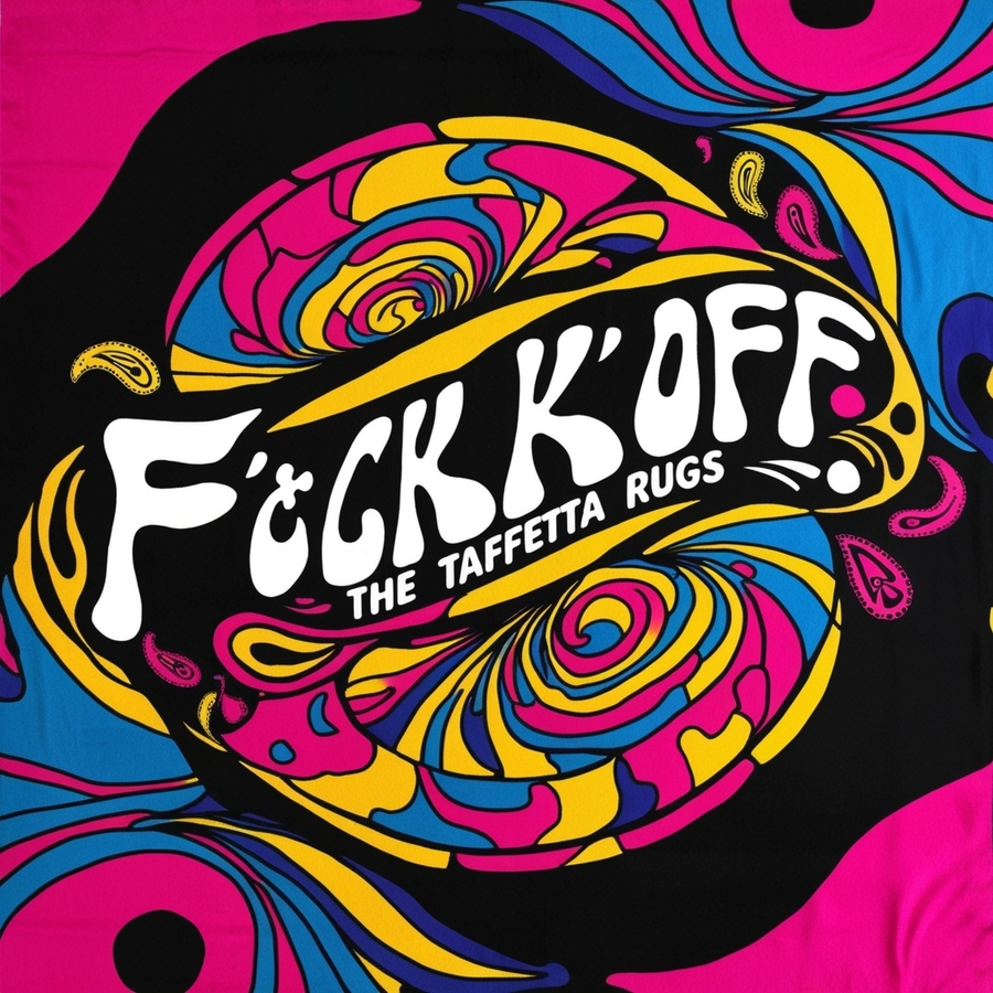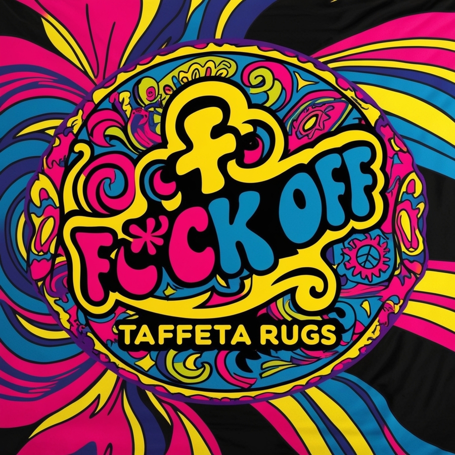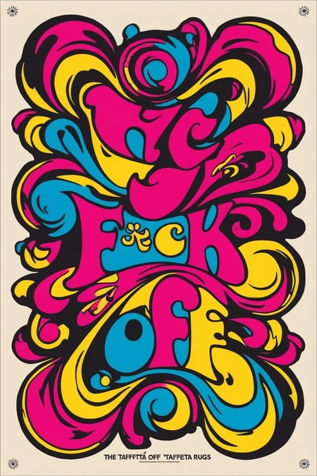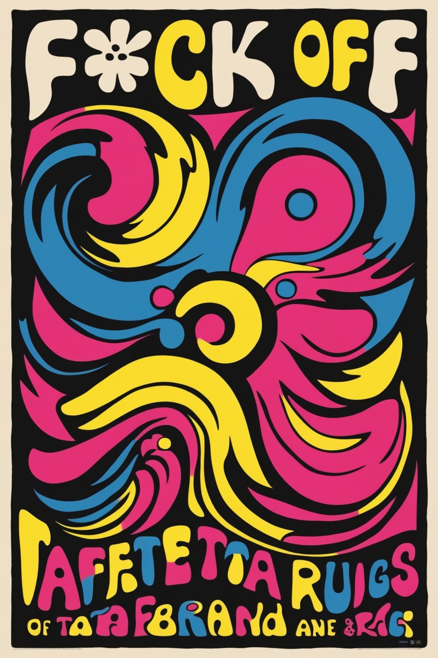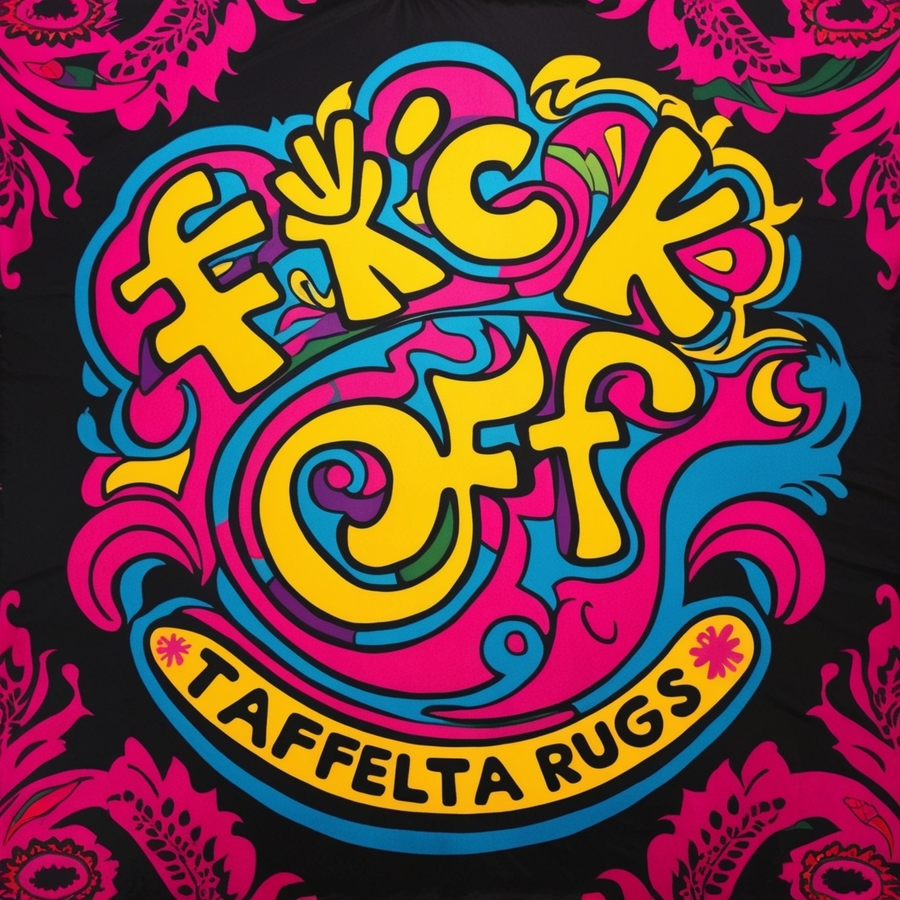 /image prompt: create a vibrant, psychedelic logo for the F*ck Off brand of taffeta rugs that evokes the iconic 1960s pop art and hippie style with bold, swirling patterns and bright, clashing colors like bright pink, electric blue, and sunshine yellow, set against a contrasting background of deep black or white, featuring stylized, hand-drawn typography with irregular lines and rounded edges, peace signs, or other symbols of the hippie counterculture.