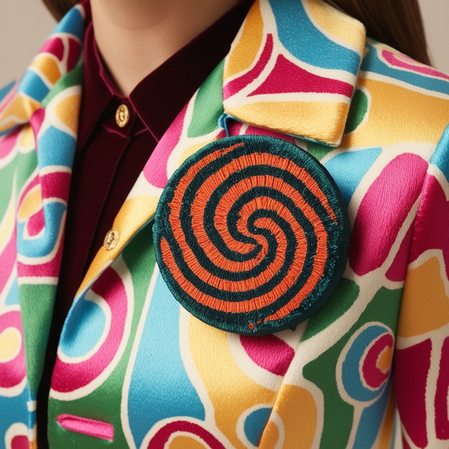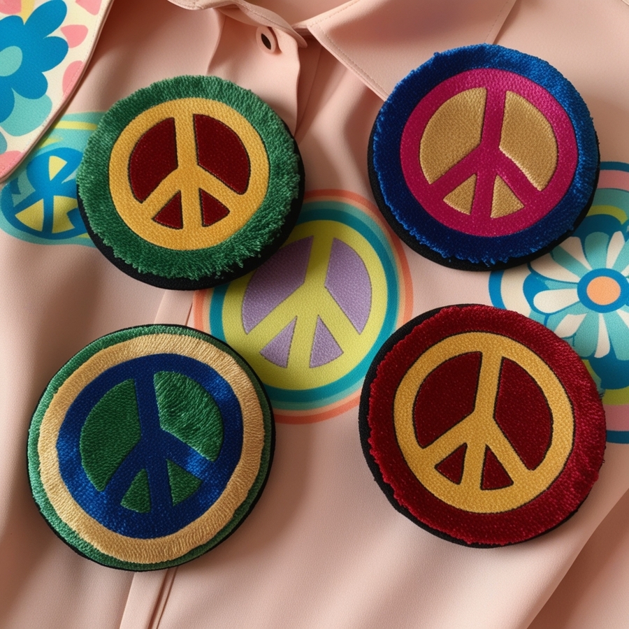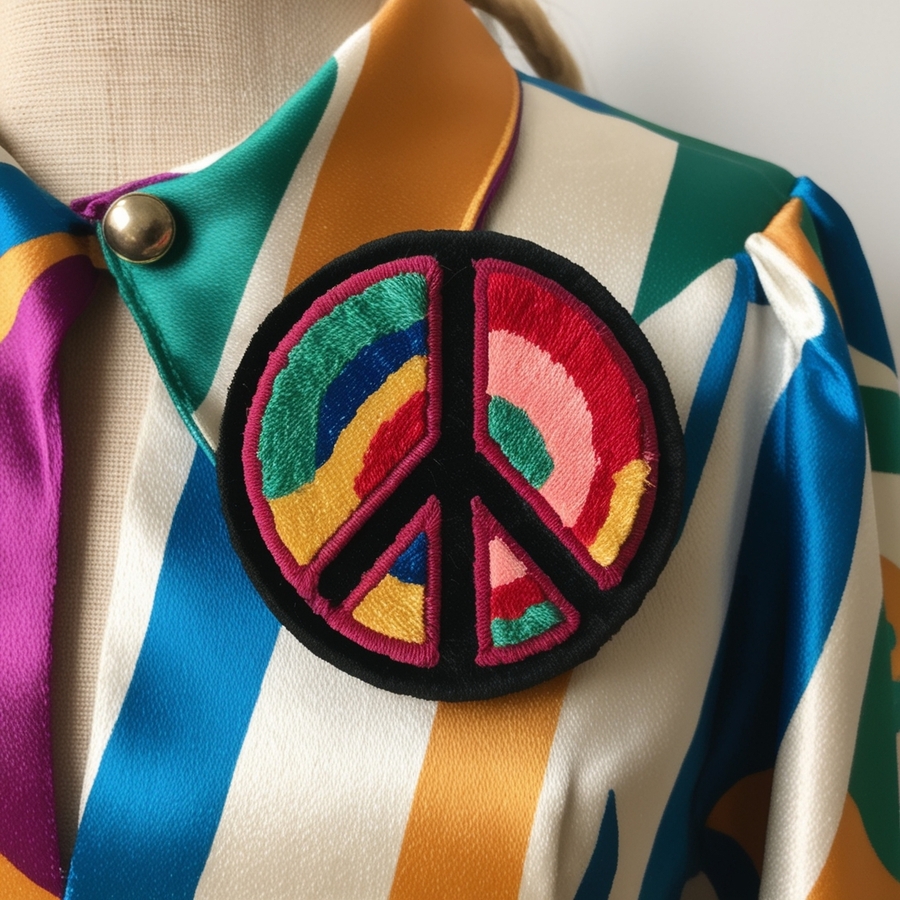 /image prompt: create pins on clothing in the form of small taffeta rugs in a style reminiscent of iconic pop art and 1960s hippie style in the form of bold swirling patterns, peace signs, or other symbols of the hippie counterculture.
