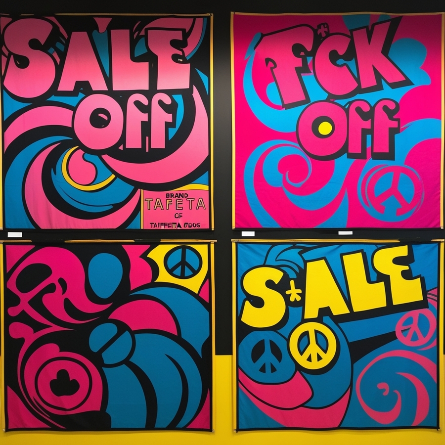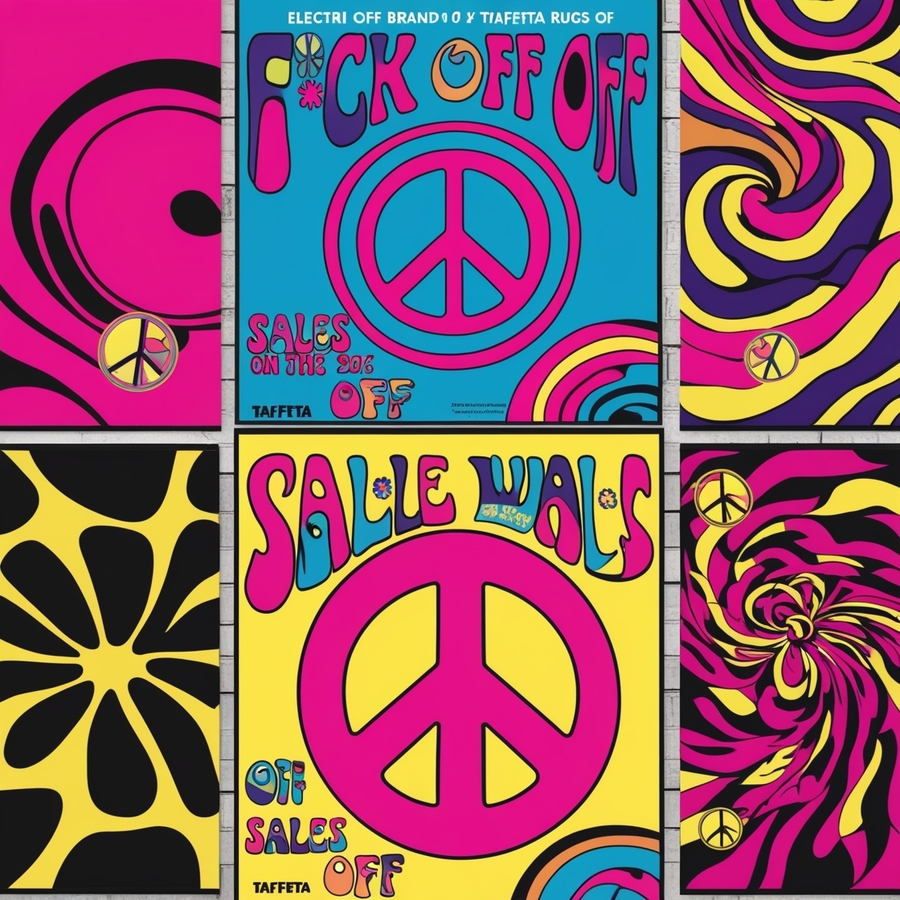 /image prompt: create posters about sales on the wall of the F*ck Off brand of taffeta rugs in a style reminiscent of iconic pop art and 1960s hippie style in the form of bold swirling patterns, peace signs or other symbols of the hippie counterculture only in colors of bright pink, electric blue and sunny yellow, contrasting deep black.