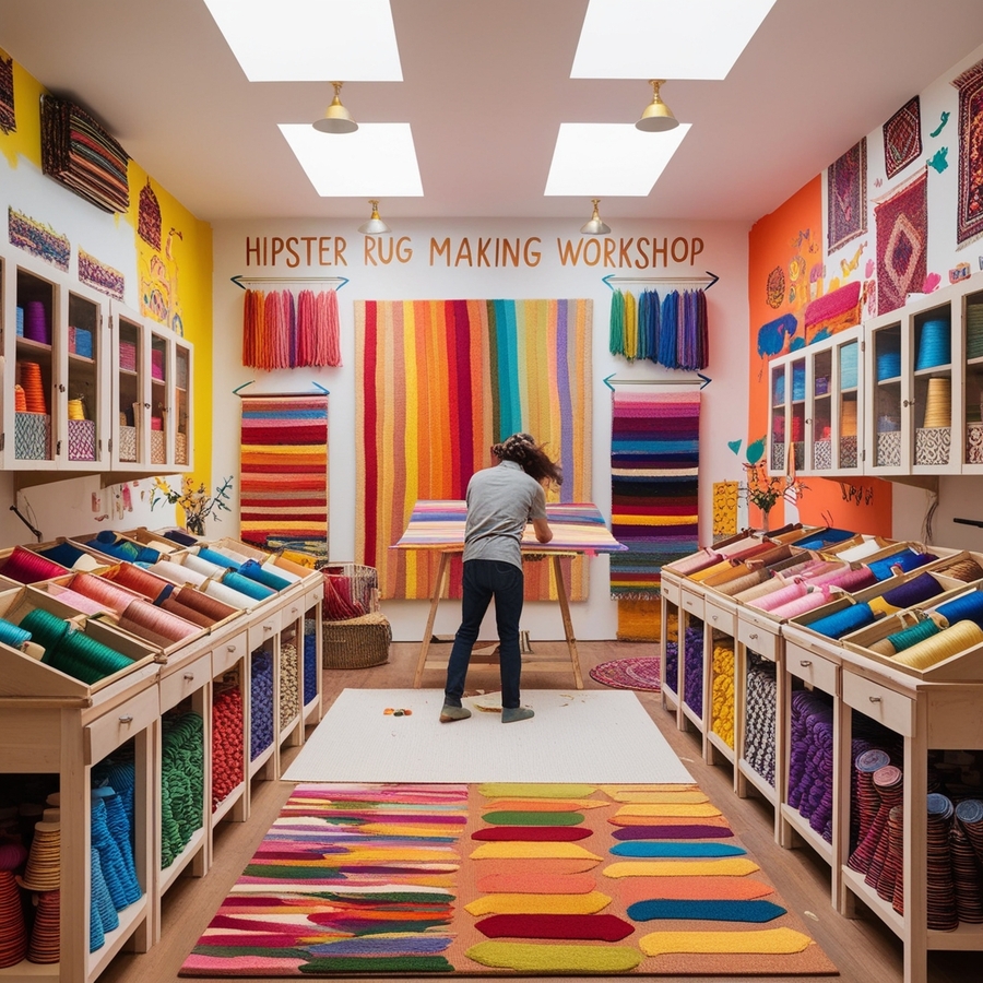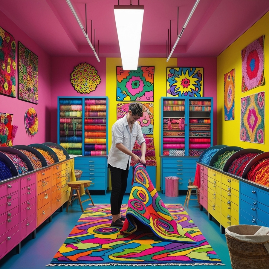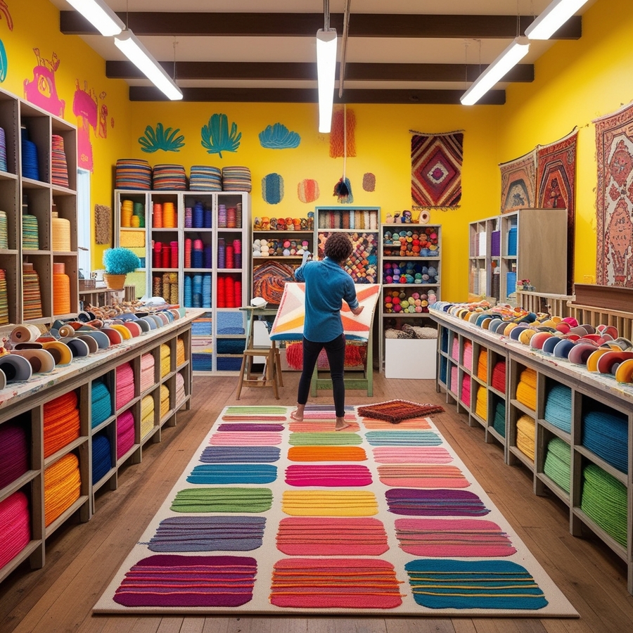 /image prompt: create a bright and atmospheric painting depicting a hipster pop art style taffeta rug making workshop. In the center of the room are many cabinets filled with bright colorful threads. In the middle of the workshop stands a person working passionately on the cloth and in the process of creating a rug. The walls of the workshop can be decorated with brightly colored drawings and samples of pop art style rugs.