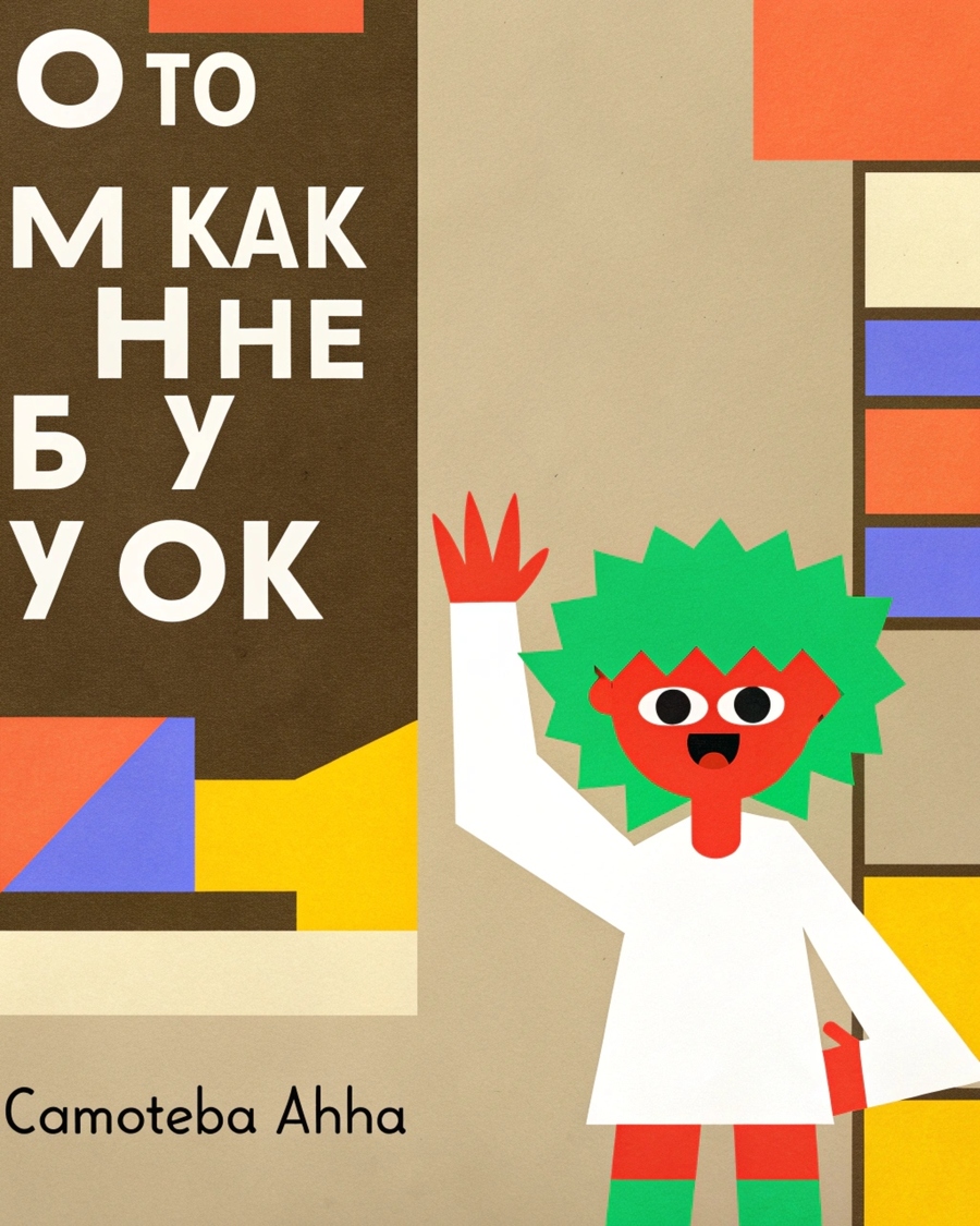 prompt for both pictures: The cover of the children’s book is colorful and playful, featuring a main character with spiky green hair in white shirt. This character is squeezing hand of another character at the right — red creature with large, teary eyes and expressive arms. The title, «О том, как Ян не выучил урок» (translated as «About How Yan Didn’t Learn His Lesson»), is displayed in bold white text at the top right. The overall design uses bright colors, paperish texture and geometric shapes to create an engaging and whimsical tone, hinting at a humorous or cautionary story. The author, «Самотеева Анна», is credited at the bottom.