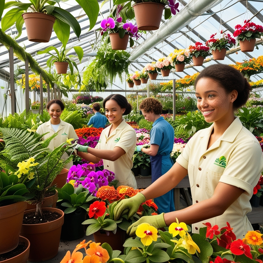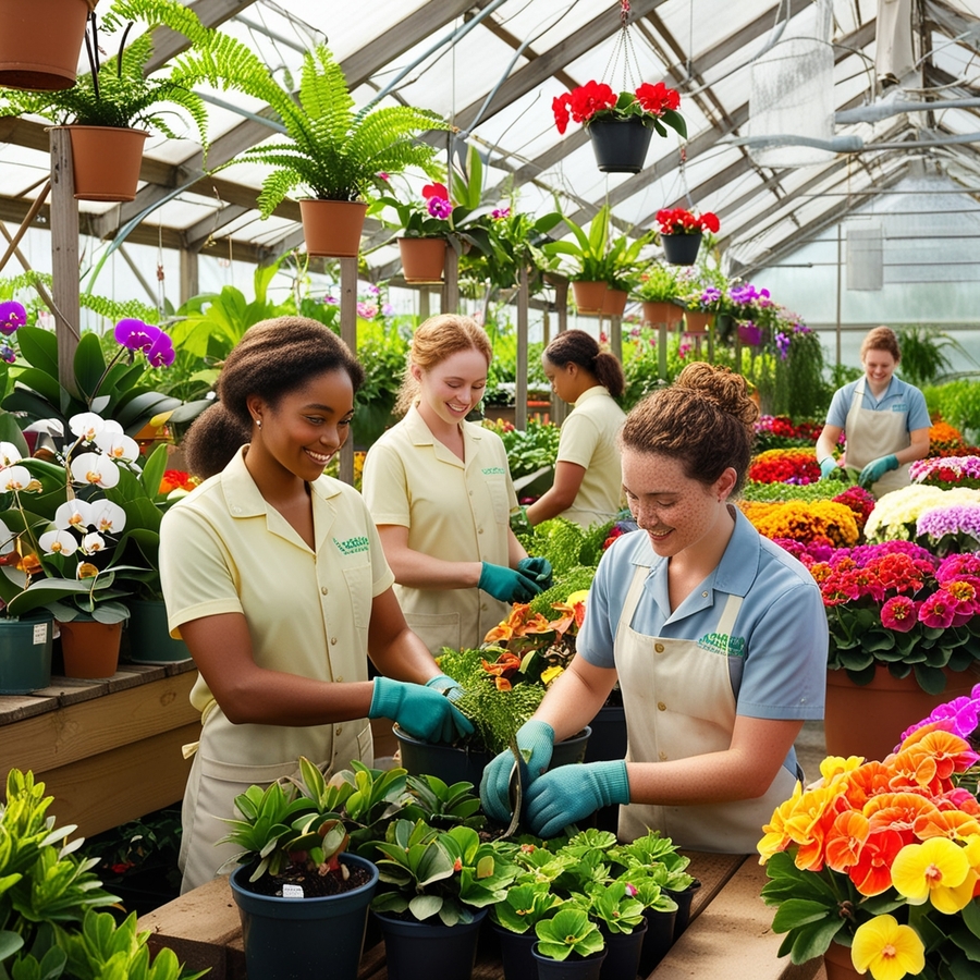 prompt for both pictures: generate a greenhouse in which people in pale yellow or blue uniforms work and care for flowers and plants