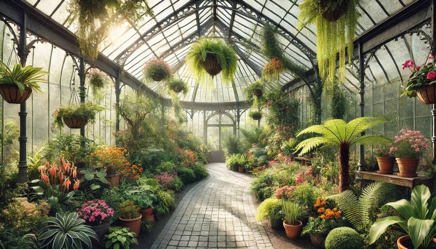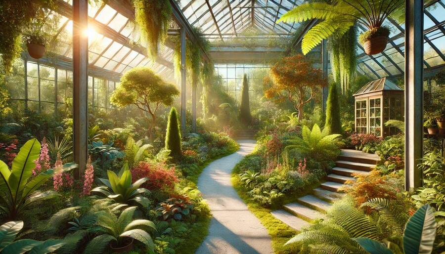 prompt for both pictures: generate a greenhouse with lots of plants and a path where the sun shines