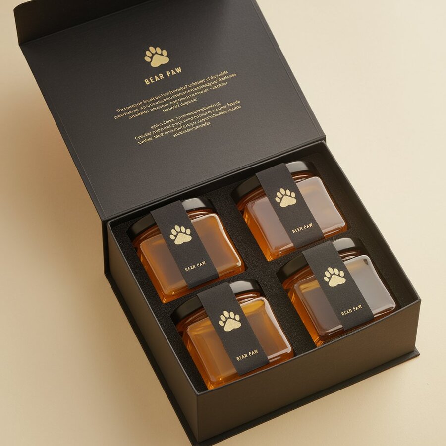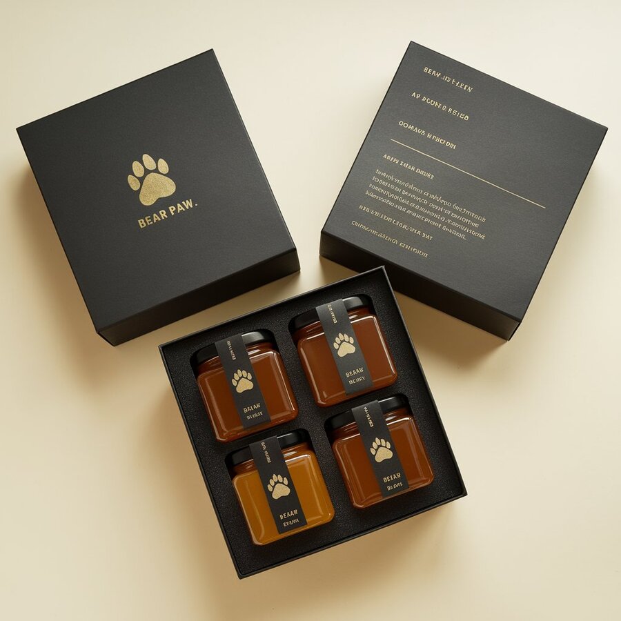Imagine prompt: Design a luxury honey gift box for a premium brand, showcasing the back side of the packaging. The box is sleek and elegant, with a minimalist black and gold color palette and subtle textural details. The back side of the box features the brand’s logo, 'BEAR PAW, ' embossed in gold foil along with minimal product descriptions and clean typography. Inside, the box contains three square-shaped glass honey jars with black matte lids and vertical black labels featuring a gold embossed bear paw logo and the brand name 'BEAR PAW.' The jars are securely arranged in a foam insert, highlighting the luxurious unboxing experience. The rich amber honey inside contrasts beautifully with the black and gold theme.