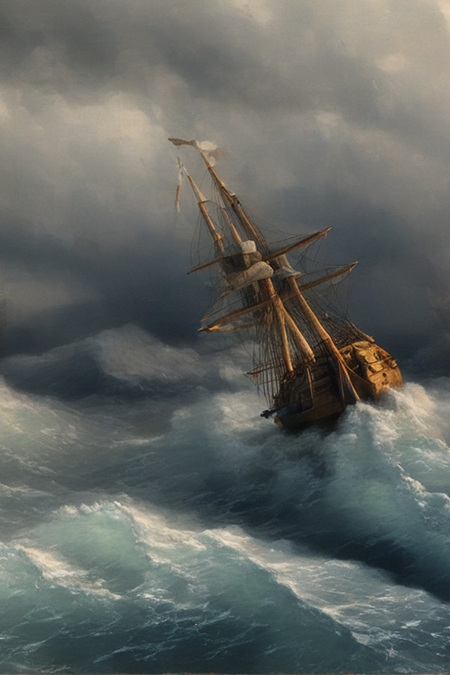 photo collage in Aivazovsky style, ship battling furious waves under a stormy sky