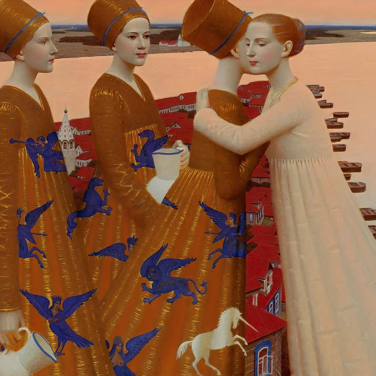 Я выбрала именно его творчество, потому что мне стало интересно, насколько точно можно обучить нейросеть воспроизводить такой сложный и многослойный стиль. Работы Ремнёва — это не просто живопись, а кропотливое рукотворное искусство, наполненное уважением к традиции. Эксперимент с нейросетью в таком контексте показался мне особенно увлекательным.