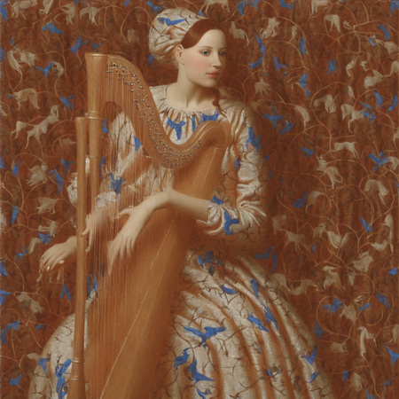 1 — a portrait of a woman playing a harp, her dress blending into the background like a tapestry, 2 — a portrait of a woman with a delicate lace veil, illuminated by candlelight