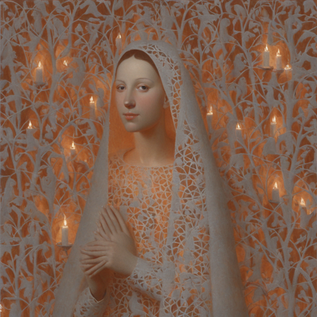 промт: a portrait of a woman with a crown of burning candles, light flickering in her eyes