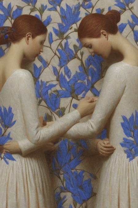 промт: two women standing back to back against a wall with blue flower-patterned tiles, one in a white lace dress, the other in a blue one, holding hands