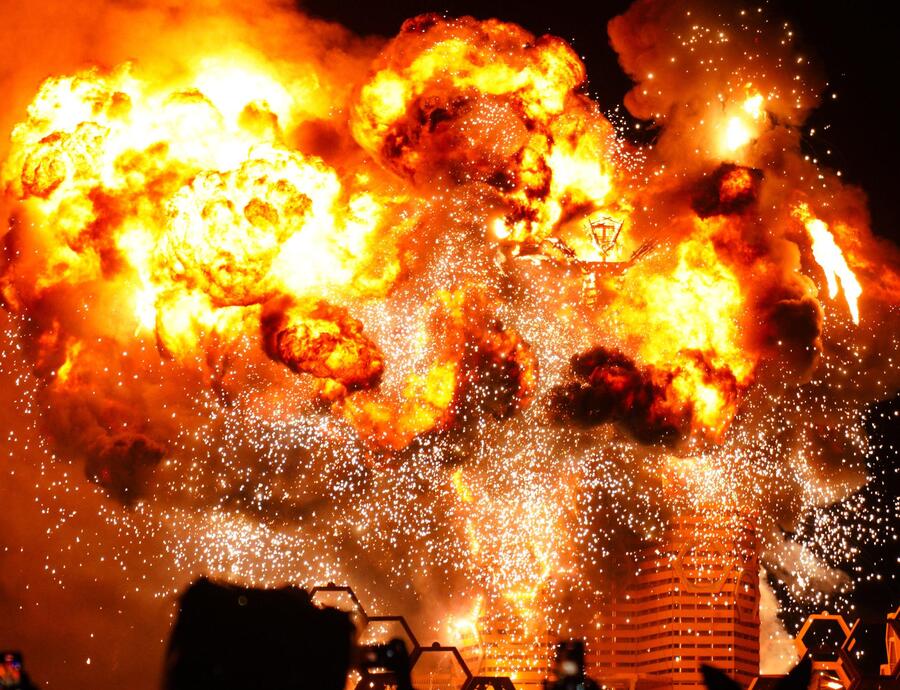 Участник фестиваля во время процесса сжигания. // Взрывы фейерверка во время сжигания. // Все фото — Тревор Хьюх для USA TODAY, 2023