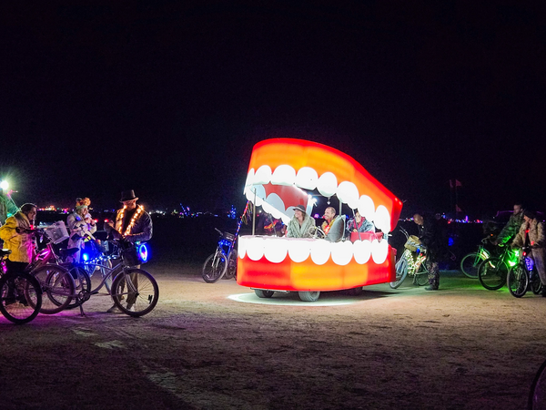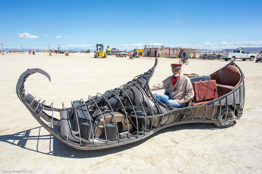 Арт-кар «Стучащие Зубы». Фото — Рэнни Викес, 2024 // Тай Экли в своём арт-мобиле Slipper. Фото — Джордж Пост, 2024