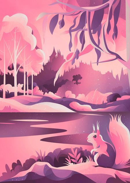 prompt: «An exquisite minimalist illustration featuring a painting reminiscent of Bob Ross’s style. The dominant color is a soothing shade of pink and violet, with subtle variations of light and dark tones. The painting showcases the beauty of nature, including a serene lake, gently swaying trees, and a friendly squirrel. The overall atmosphere is tranquil and inviting»