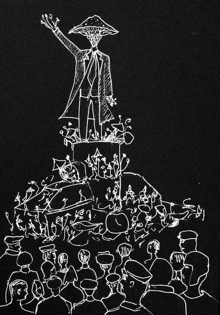 Псевдоисторическая серия иллюстраций, основанная на телевизионном сюжете Сергея Курёхина и Сергея Шолохова «Ленин — гриб». Иллюстрация краткой биографии Ленина под призмой конспирологии.