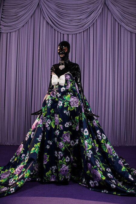 Ричард Куинн, молодой лондонский дизайнер, на февральском показе которого присутствовала королева, своим цветочным платьем и масками явно был вдохновлен Бауэри.