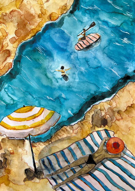 Пляжная культура и эстетика южного побережья оставляет след в памяти. Сцена у моря как мгновение, выловленное из солнечного дня. Отдых, наблюдения и летняя повседневность отсылает нас к безмятежности и беззаботности лета. Образы зонтиков, шезлонгов и силуэтов в тени передаёт настроение медленного и тёплого времени.