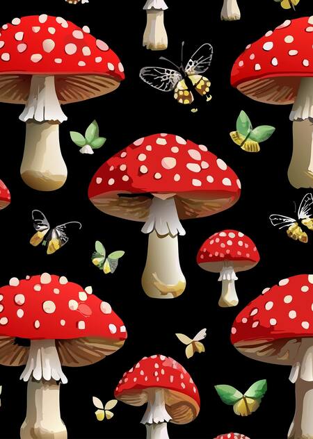 ReCraft — Нейросеть. Промт: make a pattern of mushrooms and fly agarics. reference image: https://imgur.com/a/1zMtm0j