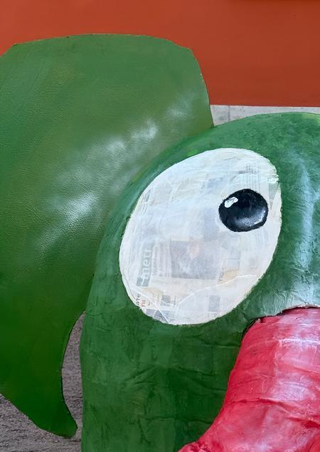 Объект выполнен из картонного каркаса и папье-маше и покрыт резиновой краской. Папье-маше, схожий с фактурой кожи слона, своей хрупкостью подчеркивает хрупкость живого существа. Резиновая краска отражает искусственность условий, в которые был помещен зверь.