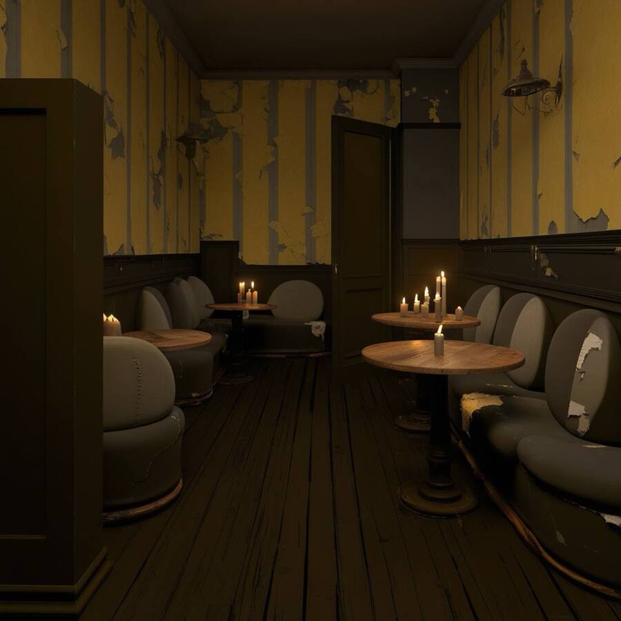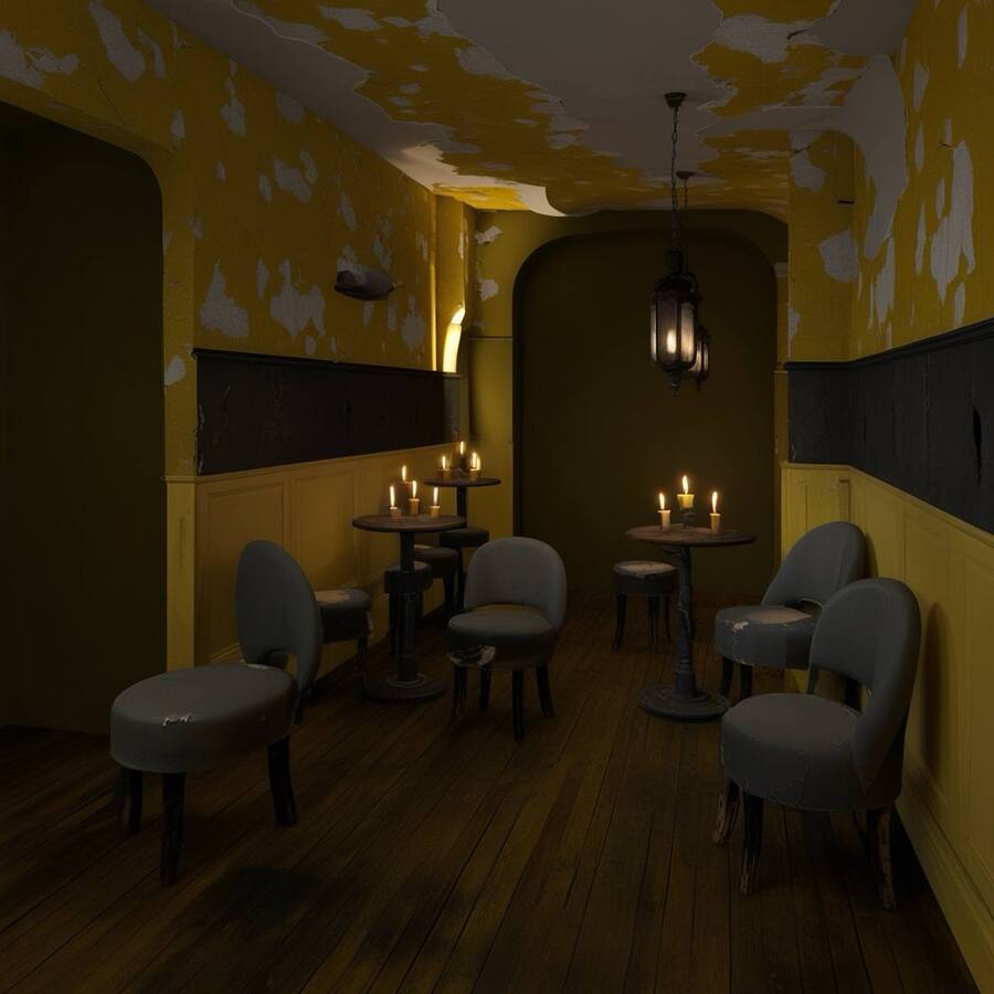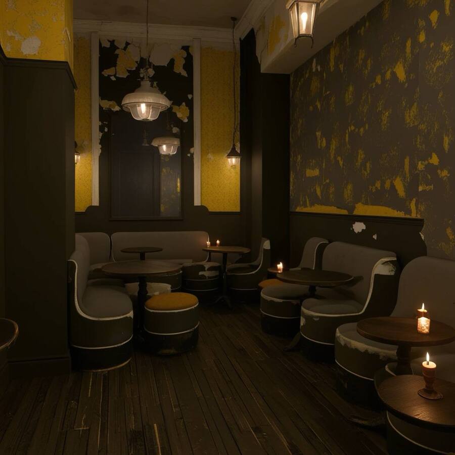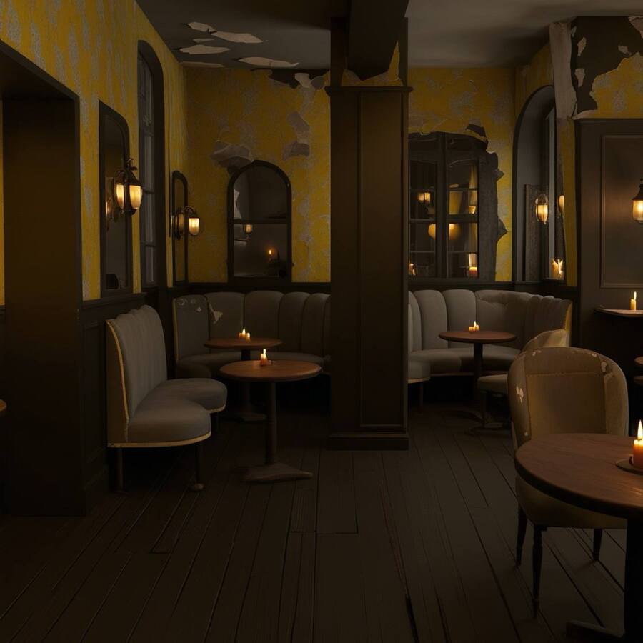 Модель: Leonardo Phoenix Пресет: Dynamic Промпт: A realistic café interior inspired by Dostoevsky, featuring a dark and moody color palette of blacks, grays, and mustard tones. The walls are covered in peeling mustard wallpaper with a light yellow pattern, creating an effect of neglect and decay. The furniture consists of simple, vintage gray upholstery with soft, rounded shapes, showing signs of wear and patchwork repairs. Round wooden tables and a floor made of dark, weathered wood enhance the atmosphere. The lighting is provided by flickering candles and old vintage lamps, casting a warm yet somber glow. The overall design should evoke a sense of gloom and poverty reminiscent of Dostoevsky’s St. Petersburg.