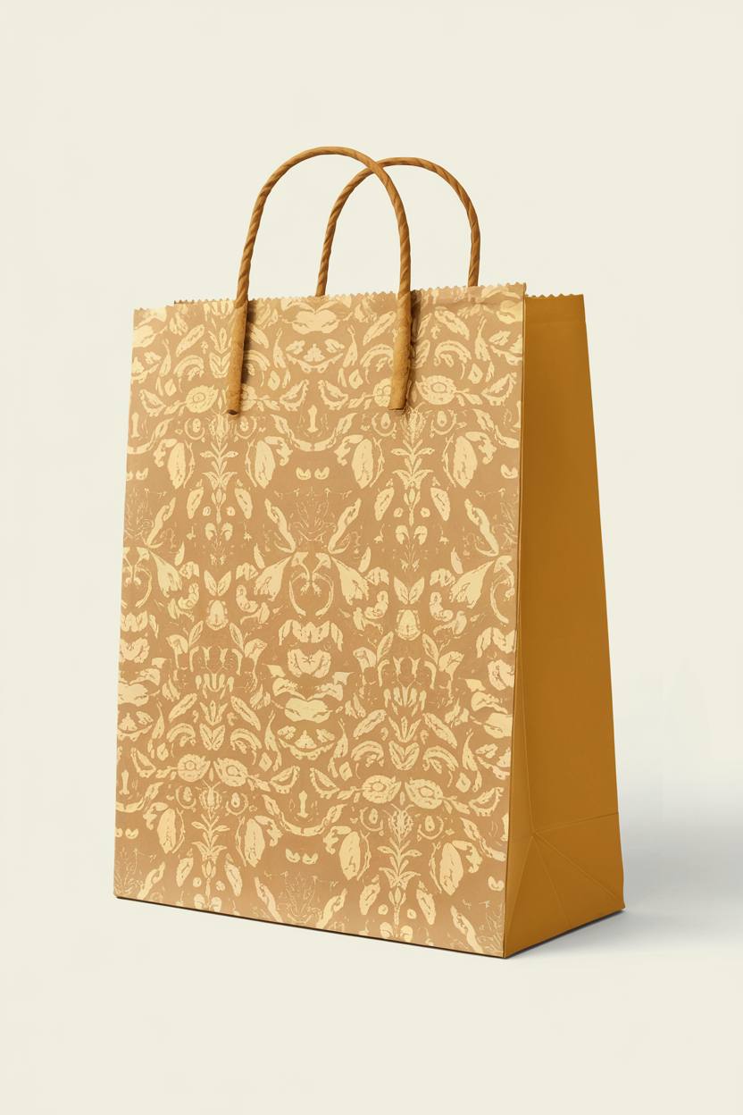 Модель: Ideogram 2.0 Промпт: Design a paper bag with handles featuring a mustard yellow base color, complemented by a light yellow pattern inspired by vintage, worn-out Soviet wallpaper. The pattern should be intricate and evoke a sense of nostalgia, resembling old, tattered wallpaper designs. The overall look should convey a charming, rustic aesthetic that appeals to customers seeking a cozy, homemade feel.