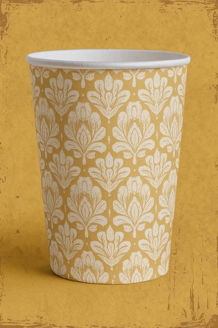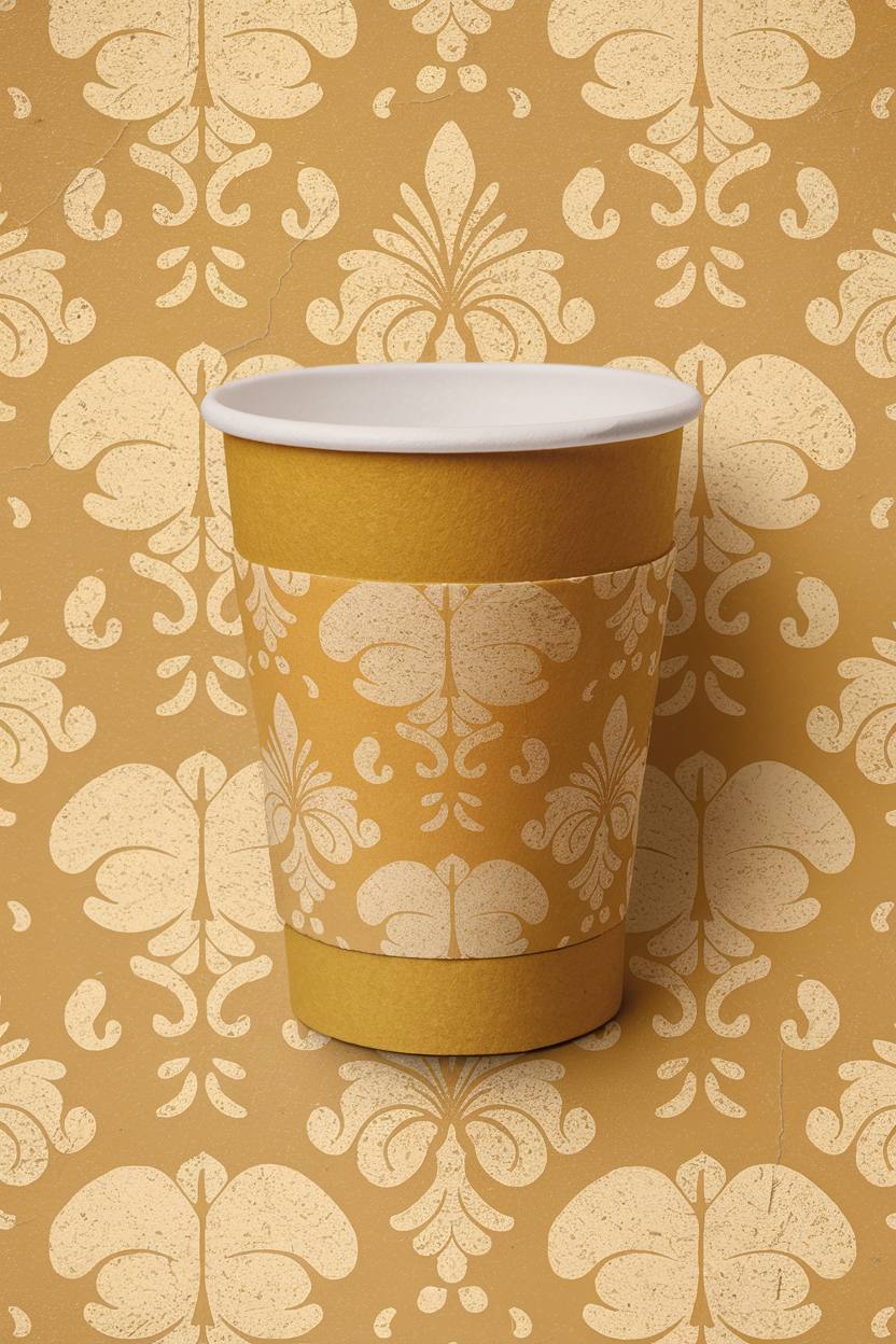 Модель: Ideogram 2.0 Промпт: Design a paper coffee cup featuring a mustard yellow base color with a light yellow pattern reminiscent of old, worn-out Soviet wallpaper. The pattern should be intricate and vintage, evoking a sense of nostalgia and warmth. Include subtle textures to give the cup a more tactile, authentic feel.