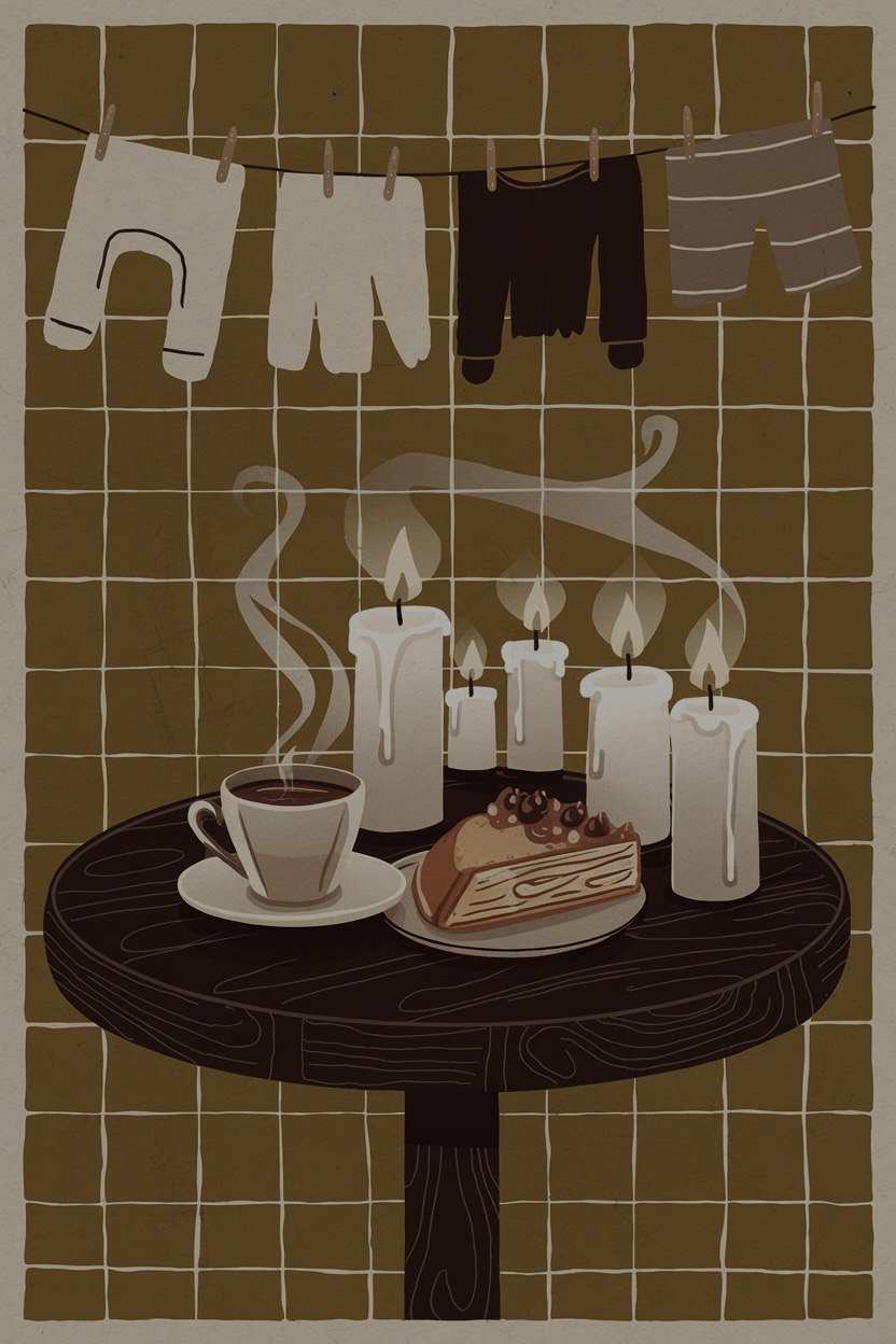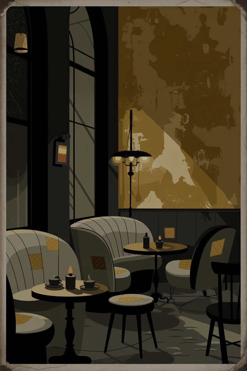 Модель: Ideogram 2.0 Промпт: Create a cozy café poster featuring a foreground with a round dark wooden table. On the table, place a steaming cup of hot coffee and a piece of homemade pastry, surrounded by flickering candles. In the background, showcase a mustard-colored tiled wall and a clothesline with drying clothes, enhancing the warm, homey atmosphere. Промпт 2: Create a café poster. The overall color scheme should consist of dark tones--blacks, grays, and mustard yellows. The background should feature worn, peeling mustard wallpaper with a subtle light o yellow pattern, conveying a sense of age and neglect. Incorporate elements of vintage, soft furniture with rounded shapes, adorned with patches, in a muted gray hue. Include small round tables made of dark wood, enhancing the rustic feel. The lighting should be warm and inviting, with candles and vintage lamps casting soft glows throughout the space. The poster should evoke a sense of gloom and poverty reminiscent of Dostoevsky’s St. Petersburg while maintaining an atmosphere of coziness. Include illustrate coffee and pastries to highlight the café offerings. Мокап взят из телеграмм канала «Photoshop Mockups»