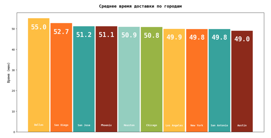 Диаграмма ниже показывает среднее время доставки в разных городах. Для каждого города этот показатель — меньше 1-го часа, а именно от 49-ти до 55-ти минут. Даллас — город с самым большим временем доставки — не самый большой город из представленных в датасете (его площадь — 1 000 км², тогда как площадь Лос Анджелеса — 1 299 км²). Возможно, это связано с небольшим количеством ресторанов тако, или тем, что через центр города проходит река, затрудняющая перемещение по городу.