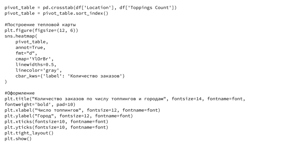 Тепловая таблица. Распределение количества заказов по числу топпингов по городам