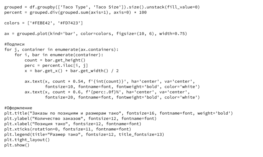 Столбчатая диаграмма. Распределение заказов по видам и размерам тако