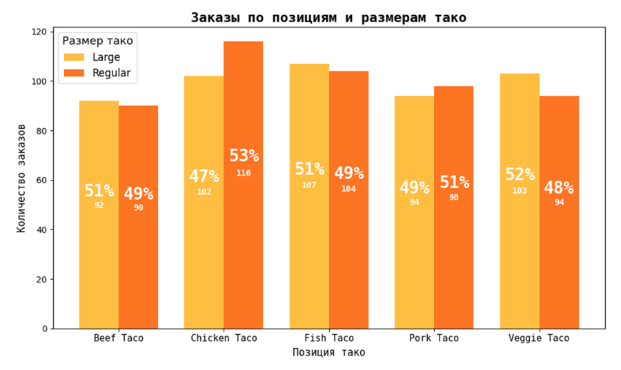 Далее я решила узнать, какой размер каждого вида тако заказывают чаще. Я создала столбчатую диаграмму, в которой для удобства сделала отображение заказанных тако разного размера как в числовом виде, так и в долях. По графику можно увидеть, что у нас нет вида тако, который большинство людей предпочитают заказывать строго определенного размера. Однако наибольший разброс между размерами виден в заказ тако с курицей: эту позицию на 6% чаще заказывают обычного размера.