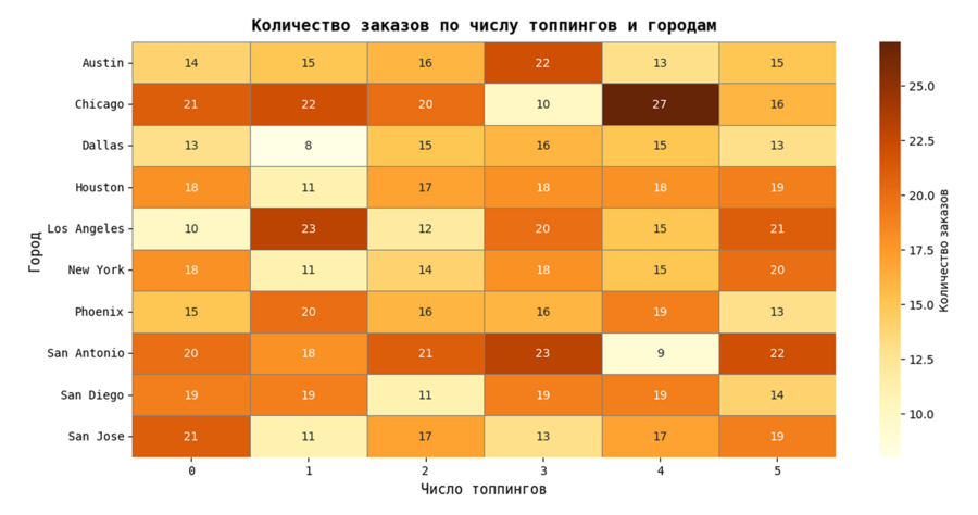 После этого я решила посмотреть, в каком городе тако заказывают с дополнительными топпингами. На тепловой карте ниже видно, что заказов с максимальным количеством топпингов (5) больше всего в Сан Антонио. А городом, в котором чаще остальных топпинги не добавляют вообще, стал Лос Анджелес. На карте также ярко выделяется количество заказов в Чикаго с 4-мя топпингами: в этом городе такой тип заказа сильно популярнее остальных.