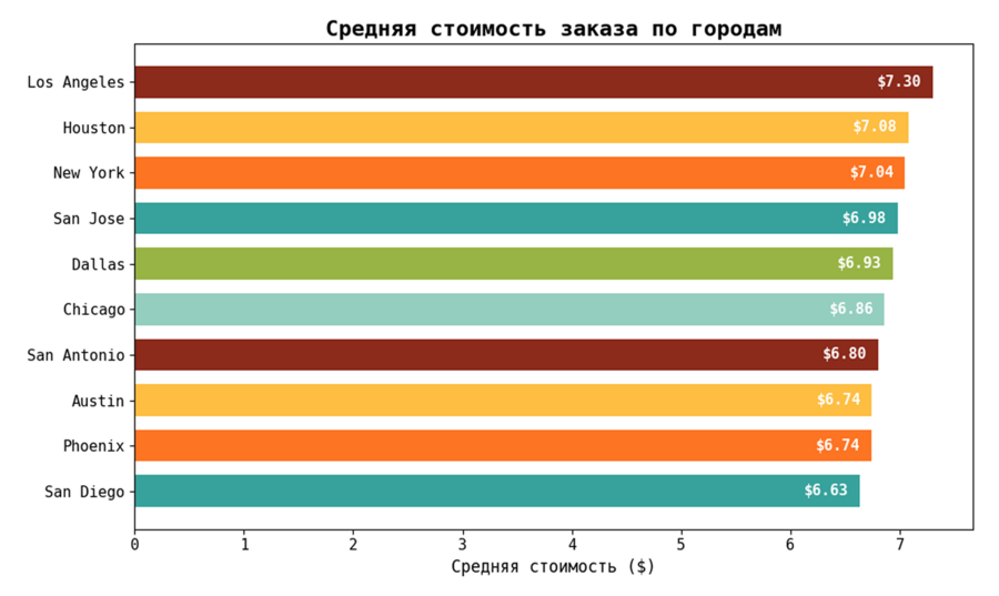 Теперь обратимся к различиям заказов в разных городах. Столбчатая диаграмма ниже показывает, сколько составляет средняя стоимость заказа для каждого города. Самым дорогим в этом плане оказался Лос Анджелес, а самым дешевым — Сан Диего. Однако разброс в цене не слишком велик: разница составляет всего 0,67$